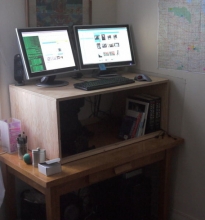 The standing desk is a simple three-sided plywood structure that raises my workstation to just below elbow level. A thick, closed-cell mat on the floor helps make standing for hours more comfortable. And comfort is a concern when making the change from sitting. I made the transition by wearing running shoes at first, and by working up from short stints to longer ones over the course of several days. Sore feet were an immediate issue that went away quickly. I found that my knees took the longest time to adapt, and were mildly achy for a couple of weeks. That these aches and pains appeared and then vanished was good evidence for the value of standing -- my body was doing more work and adapted to it happily.